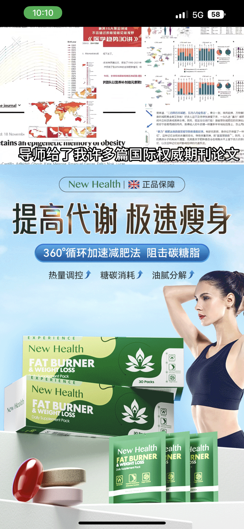 某社交平臺(tái)上博主“卡路里刺客”在視頻中展示國(guó)際權(quán)威期刊論文,并附上NewHealth新海思多維代謝每日補(bǔ)充包宣傳圖。