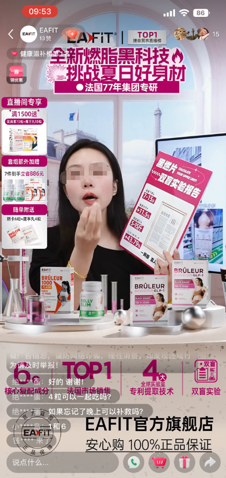 同為熱銷跨境減肥產(chǎn)品,法國(guó)品牌EAFIT黑燃片則通過(guò)直播間“場(chǎng)景化營(yíng)銷”撬動(dòng)銷量。在某社交平臺(tái)的EAFIT海外旗艦店直播間,每天早中晚時(shí)段,主播都會(huì)拿著產(chǎn)品和“成分表展板”,重復(fù)著頗具煽動(dòng)性的宣傳。